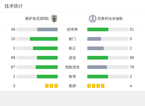 在北京时间3月9日进行的希腊足球甲级联赛降级附加赛A组第3轮比赛中,塞萨洛尼基B队主场迎战尼奥科拉米迪欧。比赛中,塞萨洛尼基B队凭借Dimitrios Chatsidis和豪尔赫-卡韦萨斯的进球取得领先。然而,尼奥科拉米迪欧由Samson Ebuka Obioha扳回一城。最终,塞萨洛尼基B队以2-1战胜尼奥科拉米迪欧。