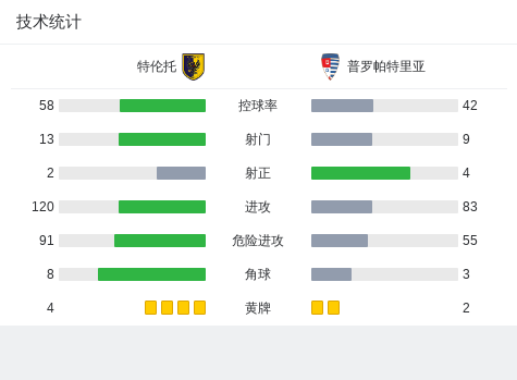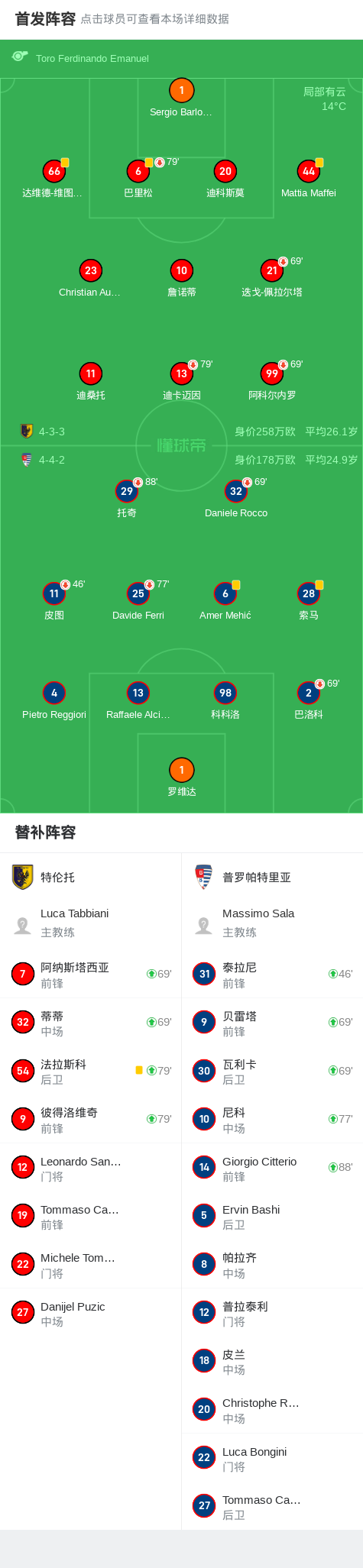 特伦托0-0普罗帕特里亚,难分伯仲遭意丙4连平战报bot @懂球帝2025-03-09 23:52在北京时间3月9日进行的意大利足球丙级联赛A组第30轮比赛中,特伦托主场迎战普罗帕特里亚。尽管双方在场上全力以赴,互有攻守,但均未能打破僵局。最终,比赛以0-0的比分结束,两队握手言和。点击查看本场比赛详细数据>>点击查看意丙完整积分榜>> 球队阵容 技术统计 展开更多