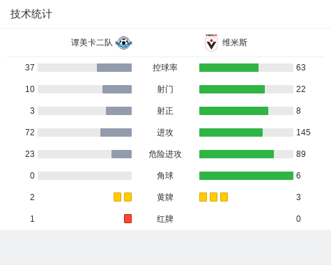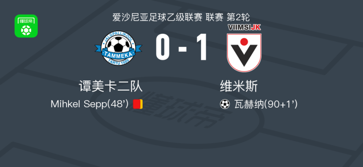北京时间3月9日,爱沙尼亚足球乙级联赛第2轮,谭美卡二队主场迎战维米斯。比赛中,谭美卡二队的Mihkel Sepp因累计两张黄牌被罚离场。在比赛尾声阶段,维米斯的瓦赫纳成功攻入一球,帮助球队取得领先。最终,维米斯以1-0战胜谭美卡二队,全取三分。