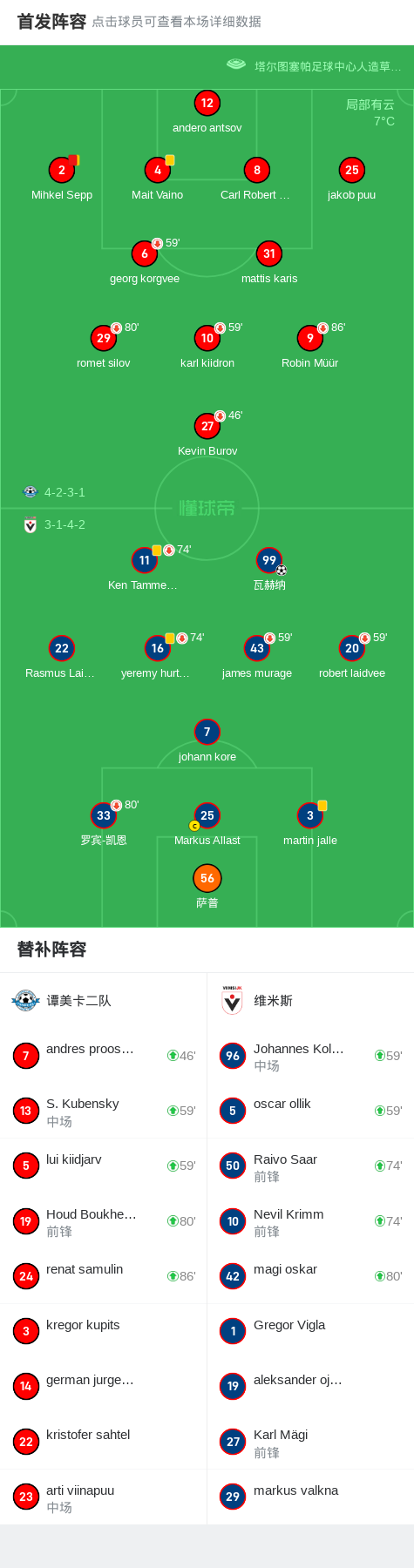 第48分钟,谭美卡二队球队Mihkel Sepp吃到第二张黄牌。