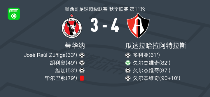 下半场补时第10分钟,瓜达拉哈拉阿特拉斯球员科卡罗助攻久尔杰维奇打入一球。