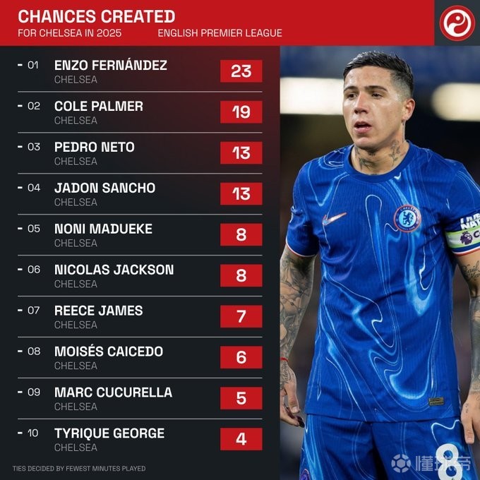 根据统计,2025年到目前为止,恩佐在英超比赛中创造了23次机会,比任何其他切尔西球员都多,而且,他是今年唯一一位在三场不同比赛中创造5+次机会的英超球员。