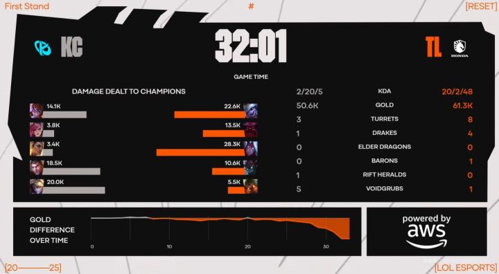 第31分钟,KC五人抱团推进在高地击杀TL三人后轻松推掉基地拿下首局,2-20。