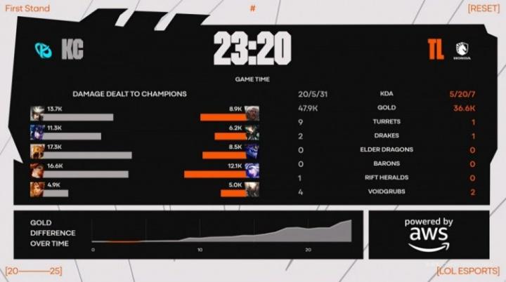 第22分钟,KC破TL中下两路高地塔,Imapct空大,CoreJJ直接被秒,KC打出0换4拆掉TL基地扳平比分,20-5。