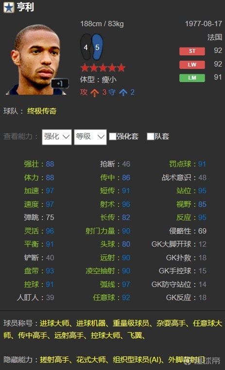 而随着FIFA OL3终极传奇的推出,亨利的球迷终于可以在游戏中使用自己的偶像去摧城拔寨了。游戏中的亨利初始能力值92,拥有188cm,83KG的完美模型,初始双速达到了97,射术更是超越了马拉多纳达到了96,绝对是目前国服内的第一前锋。