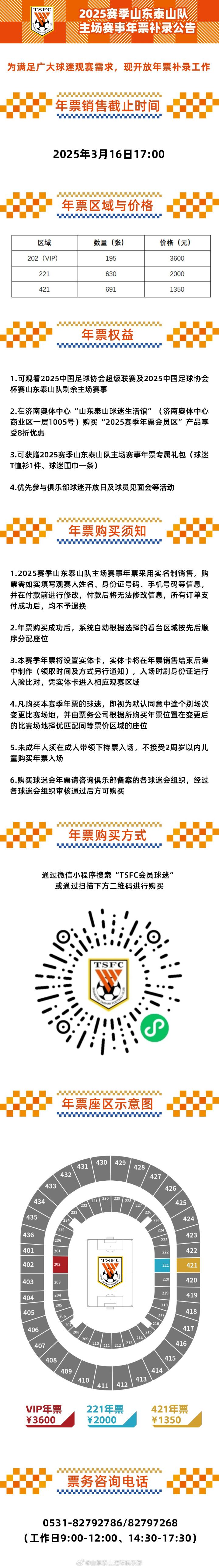 山东泰山发布年票补录公告:截止时间为3月16日17:00ZeroTsu_02 @懂球帝2025-03-11 09:37北京时间3月11日,山东泰山官方发布年票补录公告,年票销售截止时间为3月16日17:00。销售截止时间2025年3月16日17:00 。年票价格及区域202(VIP)区域195张,3600元/张;221区域630张,2000元/张;421区域691张,1350元/张 。年票权益观看2025赛季中超主场赛事,在球迷生活馆购买指定产品享8折优惠,可获赠球迷专属礼包,优先参与球迷活动等。展开更多