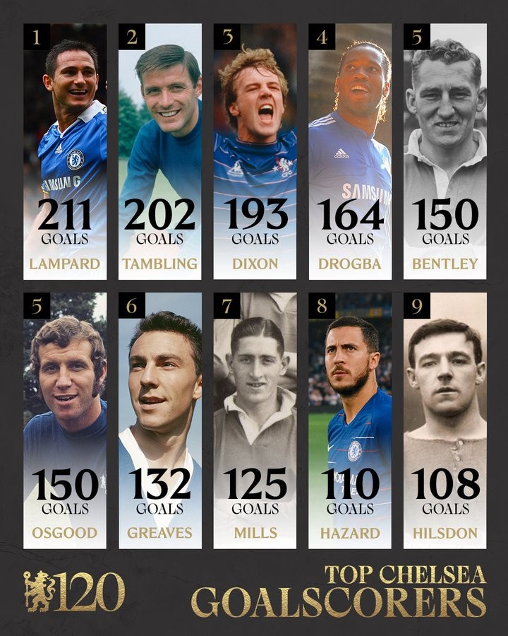 切尔西晒队史射手榜TOP10:兰帕德第1,德罗巴第4,阿扎尔第8盖坦9 @懂球帝2025-03-11 16:35昨日是切尔西俱乐部成立120周年纪念日,今日切尔西官方晒出队史射手榜TOP10,兰帕德第1,德罗巴第4,阿扎尔第8。切尔西队史射手榜TOP101-兰帕德 211球2-坦布林 202球3-狄克逊 193球4-德罗巴 164球5-罗伊-本特利 150球5-奥斯古德 150球6-格里夫斯 132球7-乔治-米尔斯 125球8-阿扎尔 110球9-希尔斯顿 108球展开更多