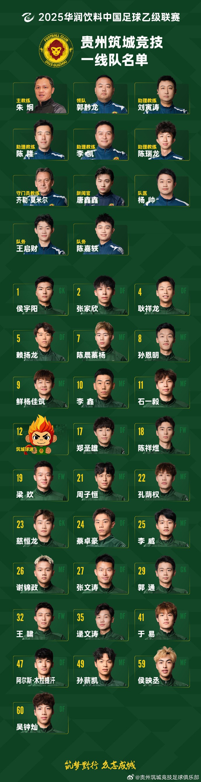 贵州筑城竞技大名单:朱炯继续挂帅,鲜杨佳筑9号、李鑫10号