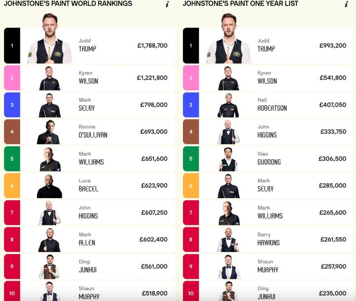 斯诺克最新世界排名:尼尔-罗伯逊夺冠后确保世锦赛种子席位