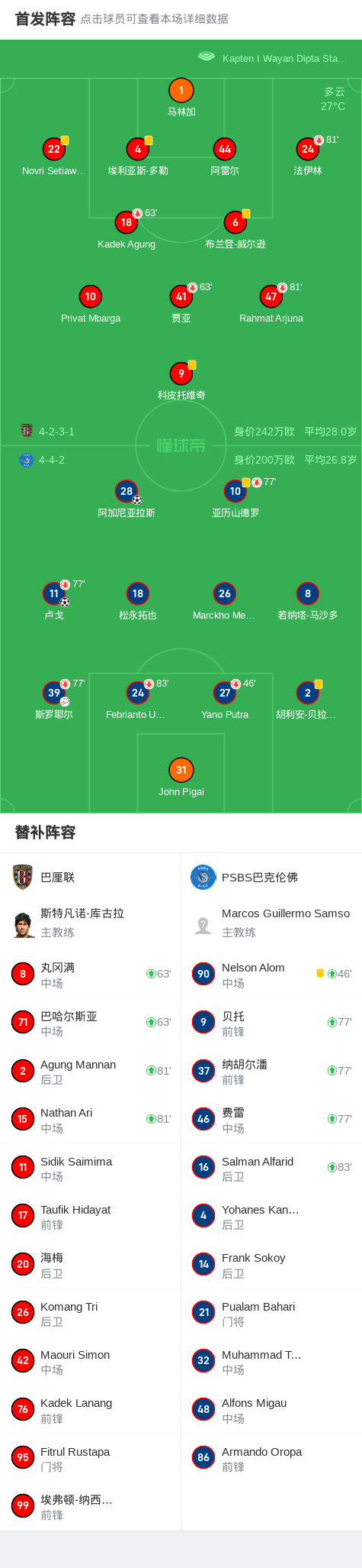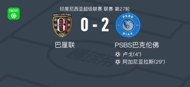 北京时间3月11日,印度尼西亚超级联赛第27轮,巴厘联主场迎战PSBS巴克伦佛。比赛中,PSBS巴克伦佛的卢戈和阿加尼亚拉斯各入一球,帮助球队取得领先并保持到终场。最终,PSBS巴克伦佛以2比0战胜巴厘联,全取三分。