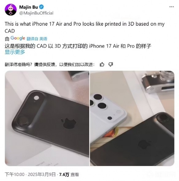近日,一位外国科技博主利用3D打印技术,根据iPhone 17 Air和iPhone 17 Pro两款手机的CAD渲染图进行了打印,全方位展示了这两款手机的具体样式。