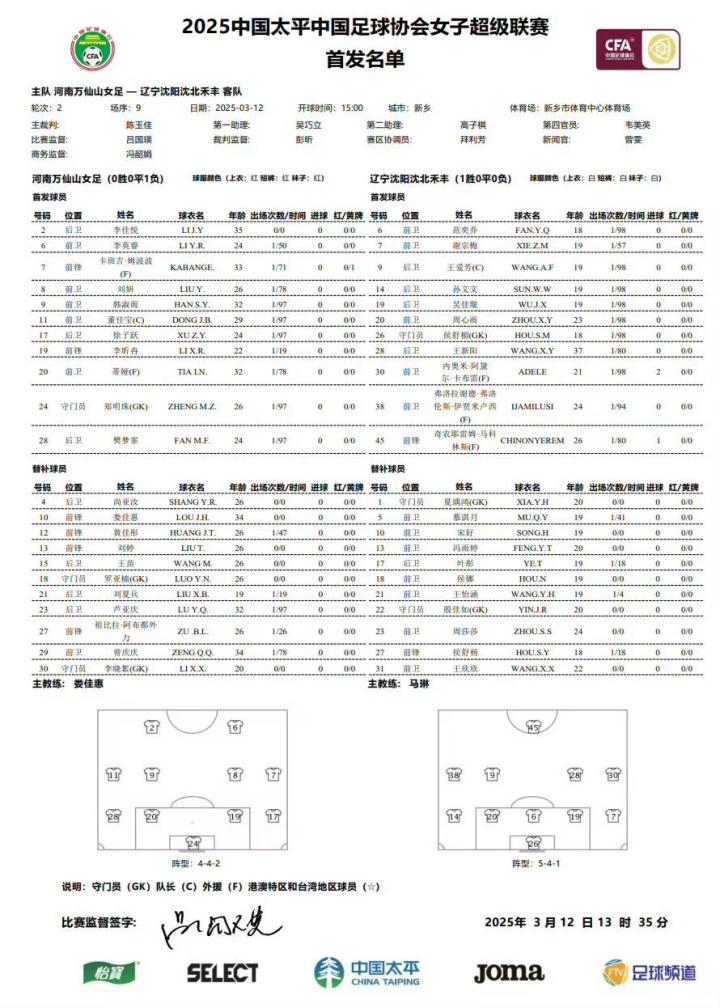 河南万仙山女足0:1辽宁沈北禾丰女足 北京时间3月12日15:00,2025中国太平中国足球协会女子超级联赛第二轮,河南万仙山女足在主场新乡市体育中心体育场迎战辽宁沈北禾丰女足。 上半场,第4分钟,辽宁沈北禾丰女足率先破门,随后两队互有攻防。半场结束,河南万仙山女足0:1 辽宁沈北禾丰女足。易边再战,河南万仙山女足在对方禁区多次造险,不过运气欠佳未能破门。 最终,河南万仙山女足0:1不敌辽宁沈北禾丰女足,北京时间3月16日15:00,河南万仙山女足将前往客场挑战陕西志丹女足。
