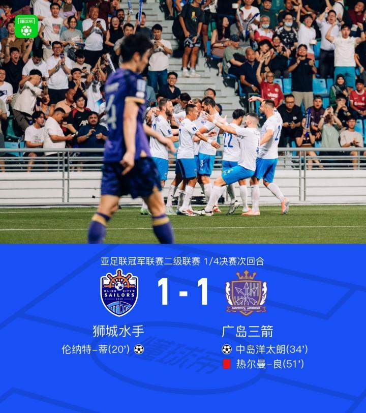 北京时间3月12日,亚足联冠军联赛二级联赛1/4决赛次回合,狮城水手对阵广岛三箭。比赛中,狮城水手凭借沙瓦尔-阿努阿尔的助攻,由伦纳特-蒂成功破门。随后,广岛三箭的中岛洋太朗也攻入一球。比赛过程中,广岛三箭的热尔曼-良因犯规被红牌罚下。最终,双方战成1-1平。两回合总比分,狮城水手以4-1淘汰广岛三箭,顺利晋级。