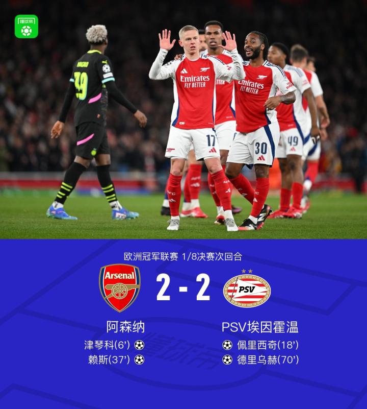 北京时间3月13日,欧洲冠军联赛1/8决赛次回合,阿森纳与PSV埃因霍温展开激烈较量。比赛中,津琴科和赖斯分别为阿森纳建功,而佩里西奇和德里乌赫则为PSV埃因霍温贡献了进球。最终,双方在这场比赛中战成2-2平局。两回合总比分,阿森纳以9-3淘汰对手,成功晋级下一轮。
