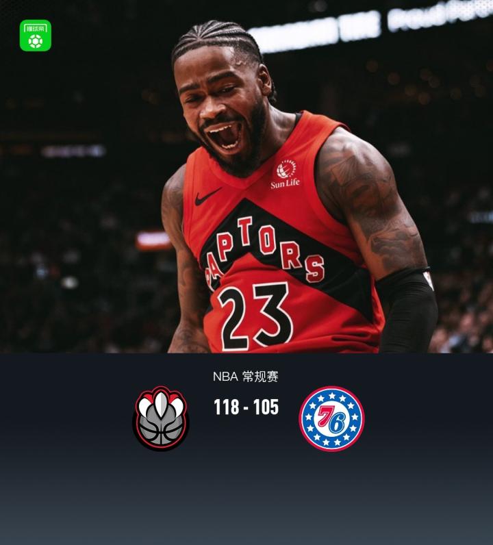 第四节猛龙奥兰多-罗宾逊拿下11分,76人杰夫-道丁拿下8分,最终猛龙118-105战胜76人