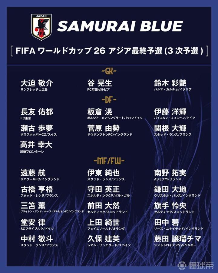 门将:大迫敬介(广岛三箭)、谷晃生(町田泽维亚)、铃木彩艳(帕尔马)
