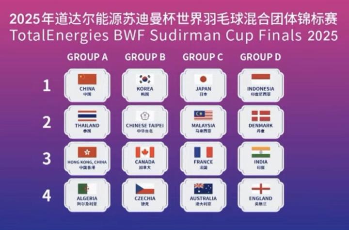 羽毛球苏迪曼杯抽签:中国、泰国、中国香港、阿尔及利亚同组我的靴子里面有蛇 @懂球帝2025-03-13 16:04第19届苏迪曼杯世界羽毛球混合团体锦标赛将于4月27日至5月4日在厦门举行,今天,小组赛分组结果出炉。卫冕冠军中国队与泰国、中国香港、阿尔及利亚同组。小组赛抽签结果A组:中国、泰国、中国香港、阿尔及利亚B组:韩国、中国台北、加拿大、捷克C组:日本、马来西亚、法国、澳大利亚D组:印度尼西亚、丹麦、印度、英格兰展开更多