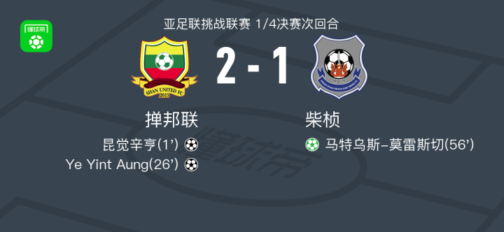 在亚足联挑战联赛1/4决赛次回合的较量中,掸邦联与柴桢展开激烈对决。比赛中,昆觉辛亨率先为掸邦联建功,随后Ye Yint Aung接昆觉辛亨的助攻再下一城,帮助球队扩大领先优势。然而,柴桢凭借马特乌斯-莫雷斯切的点球破门稳住阵脚。最终,全场比赛结束,掸邦联以2-1战胜柴桢,但两回合总比分定格在4-7,柴桢成功晋级下一轮。