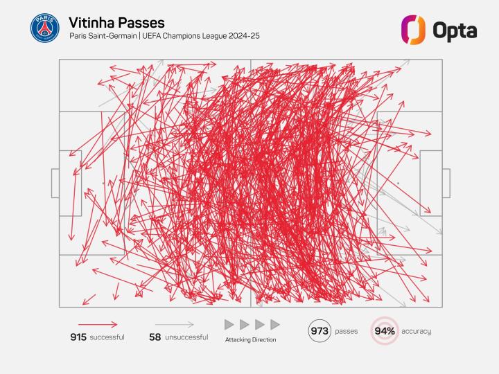 维蒂尼亚本赛季欧冠成功传球915次,有统计以来仅4名中场更多四条腿的车2025-03-14 01:47据统计,巴黎圣日耳曼中场维蒂尼亚在本赛季欧冠的成功传球次数已经位居历史前列。在本赛季截至目前的欧冠比赛当中,维蒂尼亚总共尝试了973次传球,其中915次取得成功,传球成功率达到了94%。自从2003/04赛季有相关统计以来,在单赛季欧冠当中成功传球次数比他更多的中场球员只有哈维(6个赛季)、托尼-克罗斯(2个赛季)、布斯克茨以及基米希。展开更多