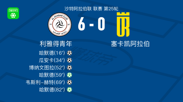 利雅得青年6-0血洗塞卡凯阿拉伯,哈默德帽子戏法,韦斯利-赫特破门