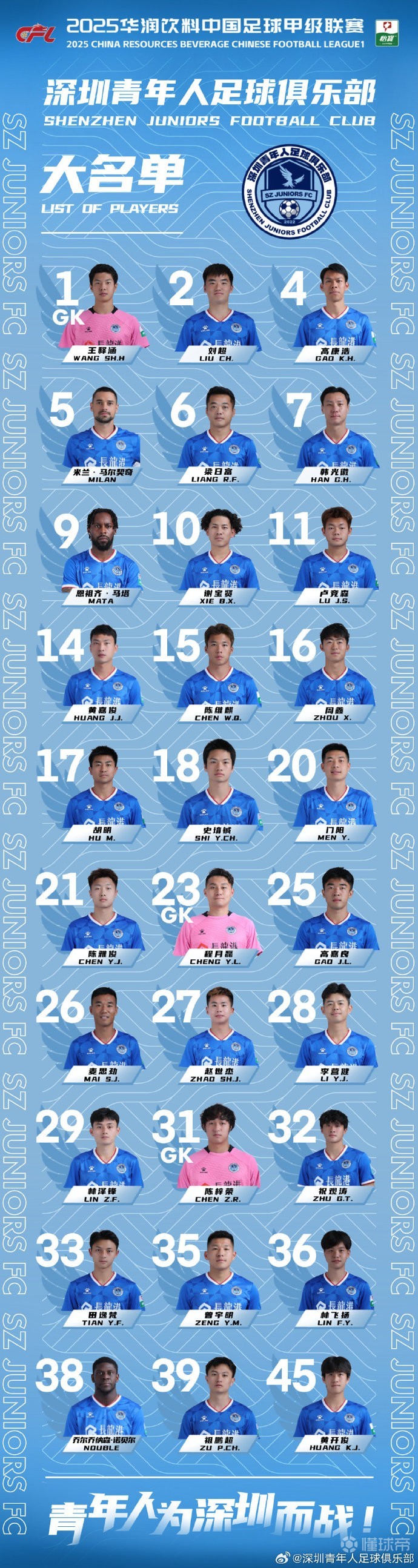 北京时间3月14日,深圳青年人公布新赛季大名单,马塔9号、谢宝贤10号、诺布尔38号。