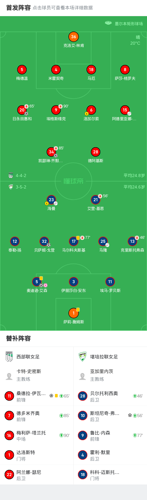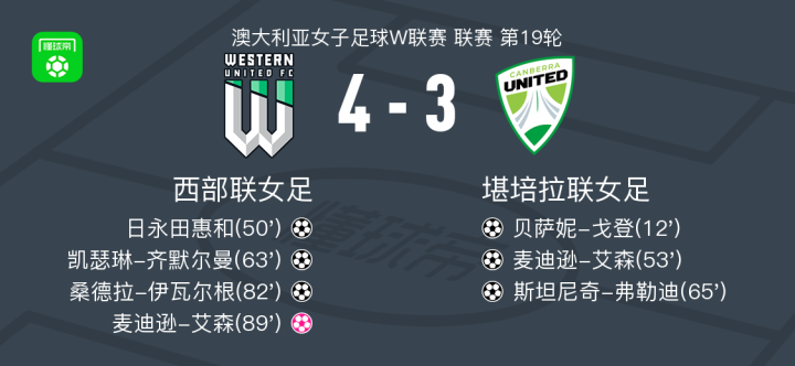 北京时间3月14日澳大利亚女子足球W联赛 联赛 第19轮,西部联女足主场对阵堪培拉联女足。西部联女足日永田惠和破门,凯瑟琳-齐默尔曼破门,桑德拉-伊瓦尔根破门。堪培拉联女足贝萨妮-戈登破门,麦迪逊-艾森破门,斯坦尼奇-弗勒迪破门,麦迪逊-艾森自摆乌龙。最终比分西部联女足 4-3 堪培拉联女足。