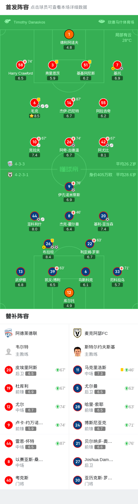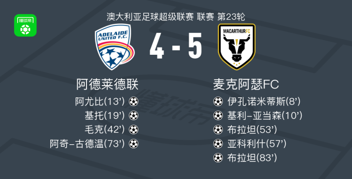 北京时间3月14日澳大利亚足球超级联赛 联赛 第23轮,阿德莱德联主场对阵麦克阿瑟FC。阿德莱德联阿尤比破门,基托破门,毛克破门,阿奇-古德温破门。麦克阿瑟FC伊孔诺米蒂斯破门,基利-亚当森破门,布拉坦梅开二度,亚科利什破门。最终比分阿德莱德联 4-5 麦克阿瑟FC。