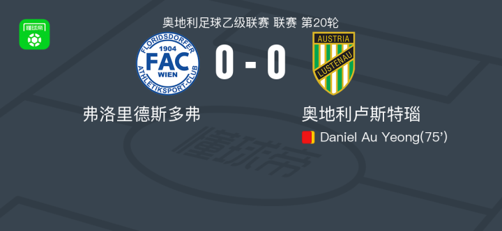 北京时间3月15日,奥地利足球乙级联赛第20轮展开争夺,弗洛里德斯多弗坐镇主场迎战奥地利卢斯特瑙。全场比赛双方均未能攻破对方球门,最终以0-0的比分握手言和。比赛中,奥地利卢斯特瑙队的Daniel Au Yeong因累计两张黄牌被罚离场。此结果反映了两队在场上的谨慎与顽强防守。