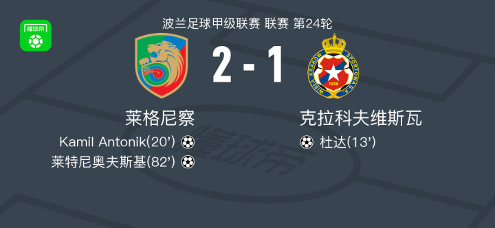 北京时间3月15日,波兰足球甲级联赛第24轮展开争夺,莱格尼察坐镇主场迎战克拉科夫维斯瓦。比赛中,克拉科夫维斯瓦率先取得领先,杜达接队友助攻打破僵局。随后,莱格尼察迅速还以颜色,Kamil Antonik在队友米奥奇的协助下扳平比分。比赛尾声阶段,莱特尼奥夫斯基挺身而出,为莱格尼察再下一城,完成反超。最终,莱格尼察以2-1战胜克拉科夫维斯瓦,成功收获三分。