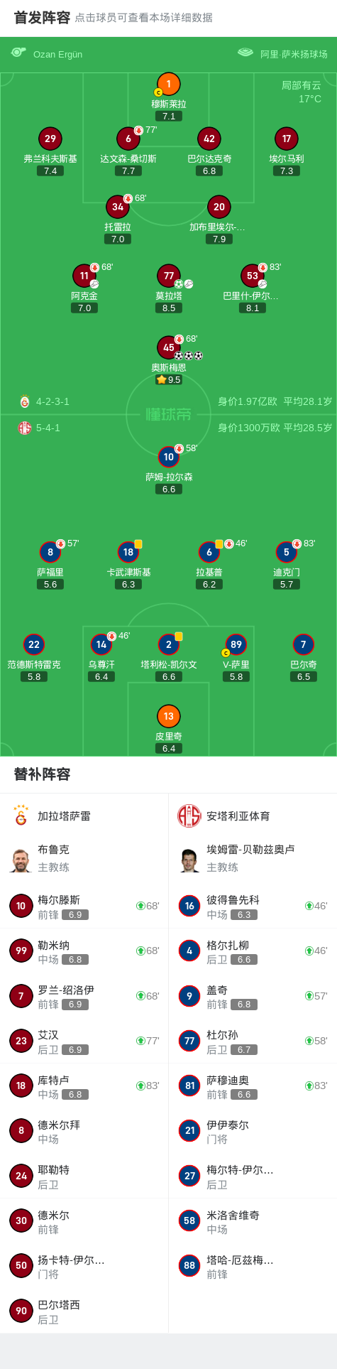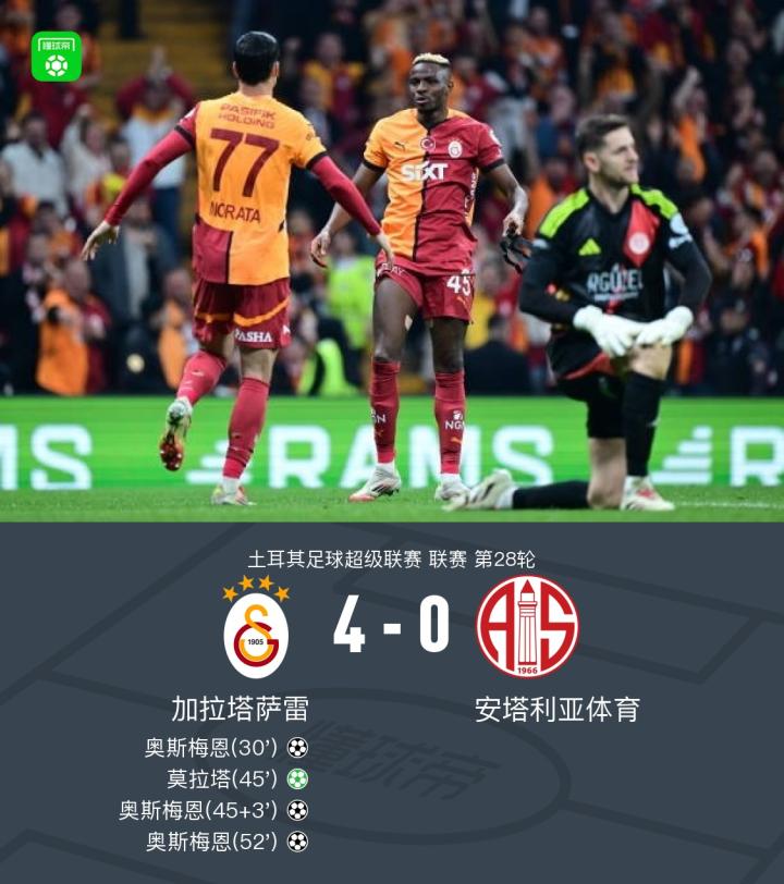 加拉塔萨雷4-0安塔利亚体育,奥斯梅恩戴帽,莫拉塔传射