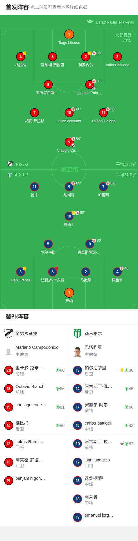 第16分钟,圣米格尔球队法昆多-卡多索吃到红牌。