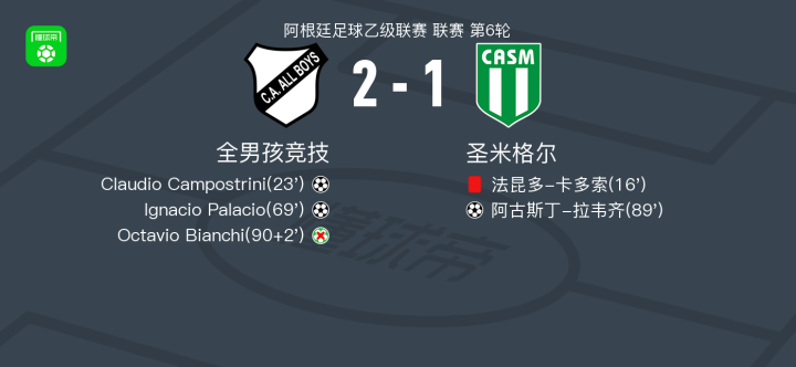 北京时间3月15日,阿根廷足球乙级联赛第6轮展开争夺,全男孩竞技坐镇主场迎战圣米格尔。比赛中,圣米格尔的法昆多-卡多索因严重犯规被裁判出示红牌罚下,这一判罚对比赛走势产生了重要影响。 全男孩竞技凭借团队配合逐渐掌控局面,Claudio Campostrini为球队首开纪录,随后Ignacio Palacio再下一城,为主队扩大领先优势。尽管圣米格尔的阿古斯丁-拉韦齐在比赛尾声阶段扳回一球,但未能改变局势。下半场补时阶段,全男孩竞技获得点球机会,但Octavio Bianchi主罚的点球遗憾未能命中,错失进一步巩固胜果的机会。 最终,全男孩竞技以2-1战胜圣米格尔,收获宝贵三分。