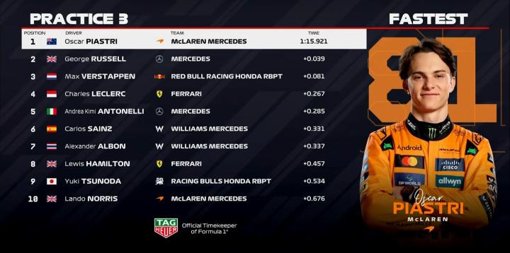 第1-第5:皮亚斯特里、拉塞尔、维斯塔潘、勒克莱尔、安东内利