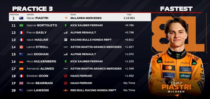 北京时间3月15日,F1 2025赛季揭幕战在澳大利亚阿尔伯特公园赛道举行,在三练中,皮亚斯特里全场最快,拉塞尔、维斯塔潘位居二三。勒克莱尔第4,安东内利第5,诺里斯第10,博托莱托第11,贝尔曼出现失误、劳森电控系统出现故障,二人无有效成绩。