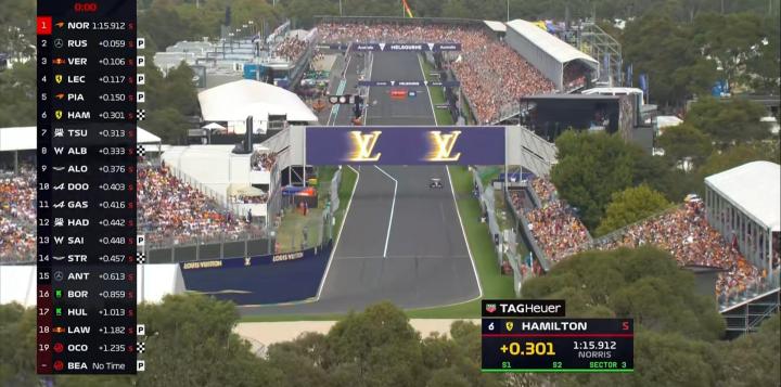 两台迈凯伦率先完成最后一个飞驰圈,诺里斯两段刷紫来到第1,皮亚斯特里来到第2!