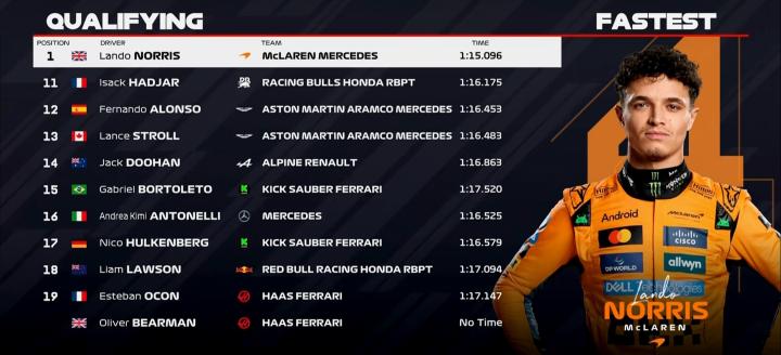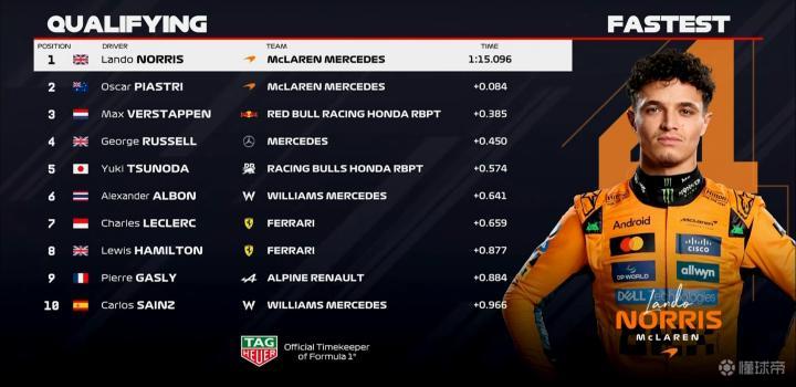 第1-第5:诺里斯、皮亚斯特里、维斯塔潘、拉塞尔、角田裕毅