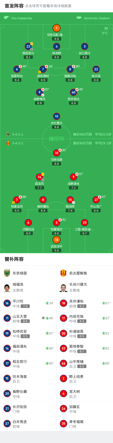 东京绿茵2-1逆转名古屋鲸鱼,纲岛悠斗建功,山见大登替补1传1射