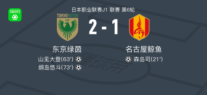 在北京时间3月15日进行的日本职业联赛J1联赛第6轮比赛中,东京绿茵坐镇主场迎战名古屋鲸鱼。比赛中,名古屋鲸鱼由森岛司率先打破僵局,为球队取得领先。随后,东京绿茵展开反击,山见大登打入一球将比分扳平。紧接着,山见大登助攻纲岛悠斗完成反超。最终,东京绿茵以2-1战胜名古屋鲸鱼,成功拿下三分。