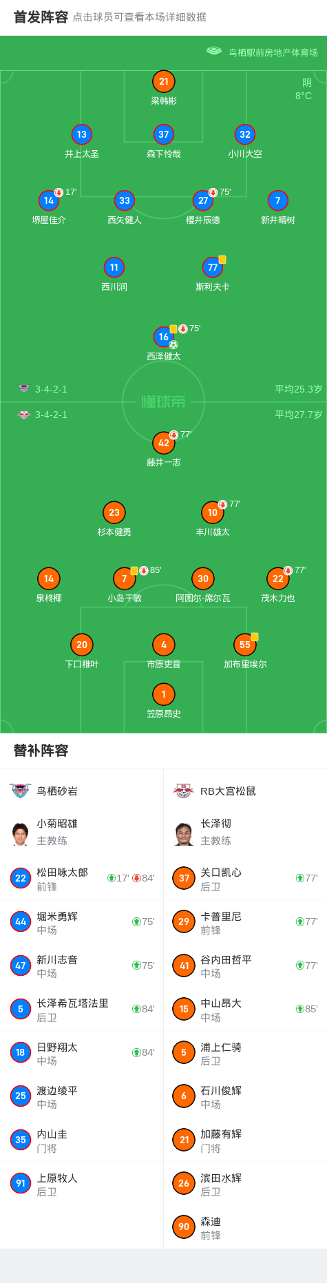鸟栖砂岩1-0RB大宫松鼠,西泽健太点射制胜战报bot @懂球帝2025-03-15 15:01日本职业联赛J2联赛第5轮,鸟栖砂岩坐镇主场迎战RB大宫松鼠。比赛中,鸟栖砂岩依靠西泽健太的点球得分,成功打破场上僵局。最终,鸟栖砂岩以1-0战胜RB大宫松鼠,全取三分。点击查看本场比赛详细数据>>点击查看日职乙完整积分榜>>精彩瞬间第39分钟,鸟栖砂岩球员西泽健太罚入点球。 球队阵容 技术统计 展开更多