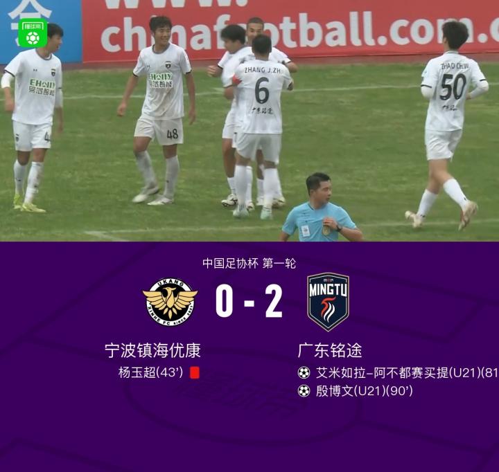 北京时间3月15日,中国足协杯第一轮展开较量,宁波镇海优康与广东铭途展开角逐。比赛中,宁波镇海优康的杨玉超因严重犯规被罚下场,导致球队陷入人数劣势。广东铭途的艾米如拉-阿不都赛买提和殷博文先后破门。最终,宁波镇海优康以0-2不敌广东铭途,遗憾止步首轮。