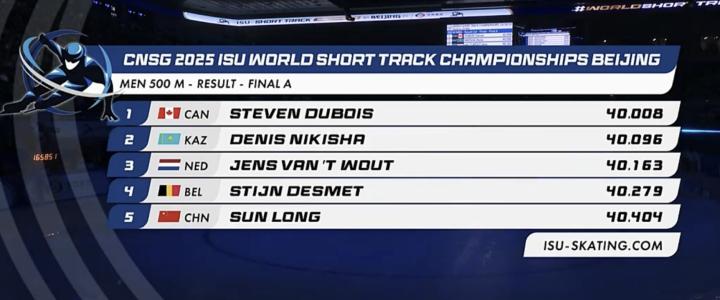 短道速滑世锦赛男子500米:孙龙第5,加拿大选手杜博伊斯夺冠我的靴子里面有蛇 @懂球帝2025-03-15 17:023月15日,短道速滑世锦赛在北京进行,男子500米A组决赛,孙龙最终获得第5名。稍早进行的半决赛中,孙龙以小组第二的成绩晋级A组决赛。决赛中,孙龙位于第5道出发,最终拿到第5名。加拿大的杜博伊斯获得冠军,哈萨克斯坦选手尼基沙获得亚军,荷兰名将范特沃特拿到季军。展开更多