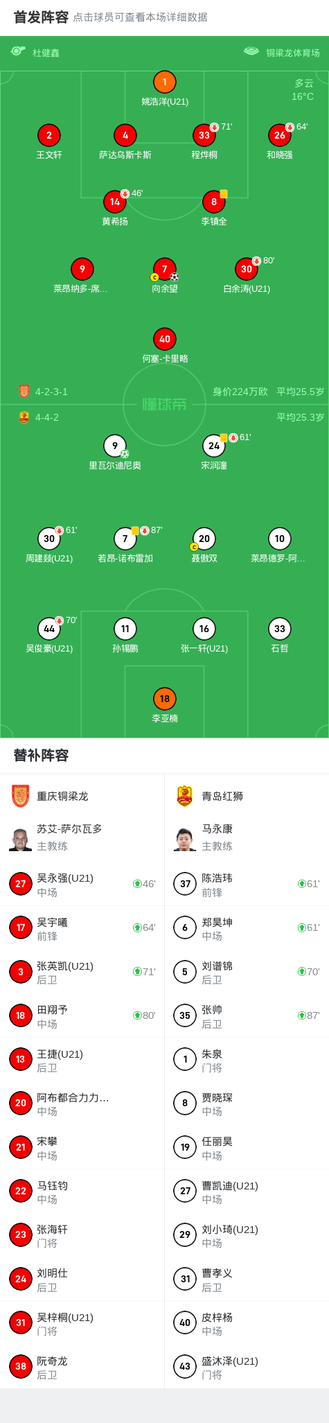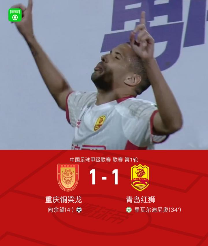 重庆铜梁龙1-1青岛红狮,向余望闪击,小里瓦尔多首秀点射