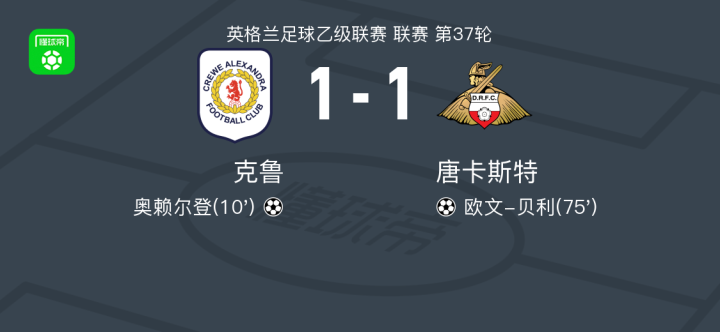 北京时间3月15日,英格兰足球乙级联赛第37轮展开争夺,克鲁主场迎战唐卡斯特。比赛开始后,克鲁凭借奥赖尔登的进球取得领先。随后,唐卡斯特通过团队配合,由欧文-贝利完成破门,将比分扳平。最终,双方以1-1的比分握手言和。