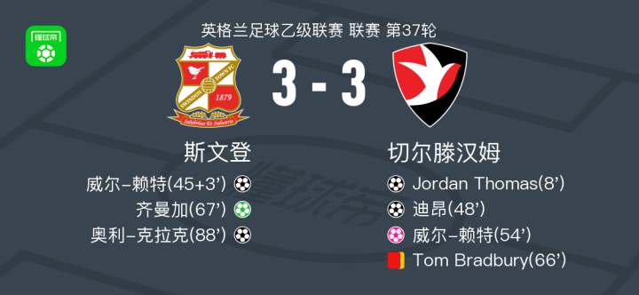 斯文登3-3切尔滕汉姆,齐曼加点射,迪昂破门