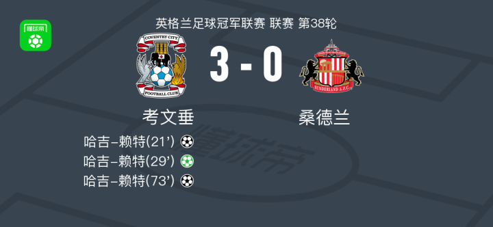 考文垂3-0大胜桑德兰,哈吉-赖特帽子戏法