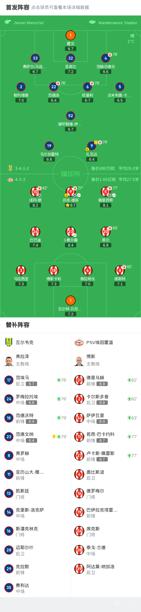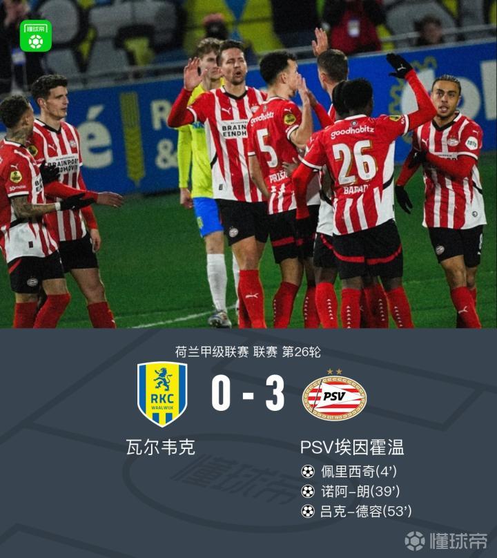 在北京时间3月16日进行的荷兰甲级联赛第26轮比赛中,瓦尔韦克主场迎战PSV埃因霍温。比赛开始后,PSV埃因霍温迅速占据主动,吕克-德容送出精准传球,佩里西奇成功将球送入网窝;随后佩里西奇投桃报李,助攻诺阿-朗扩大比分优势。之后,J-费尔曼为球队创造良机,吕克-德容把握住机会再下一城。最终,瓦尔韦克以0-3不敌PSV埃因霍温。