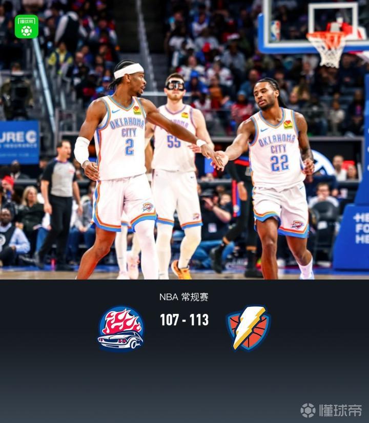 第四节活塞施罗德拿下7分,雷霆亚历山大拿下11分,最终活塞107-113不敌雷霆