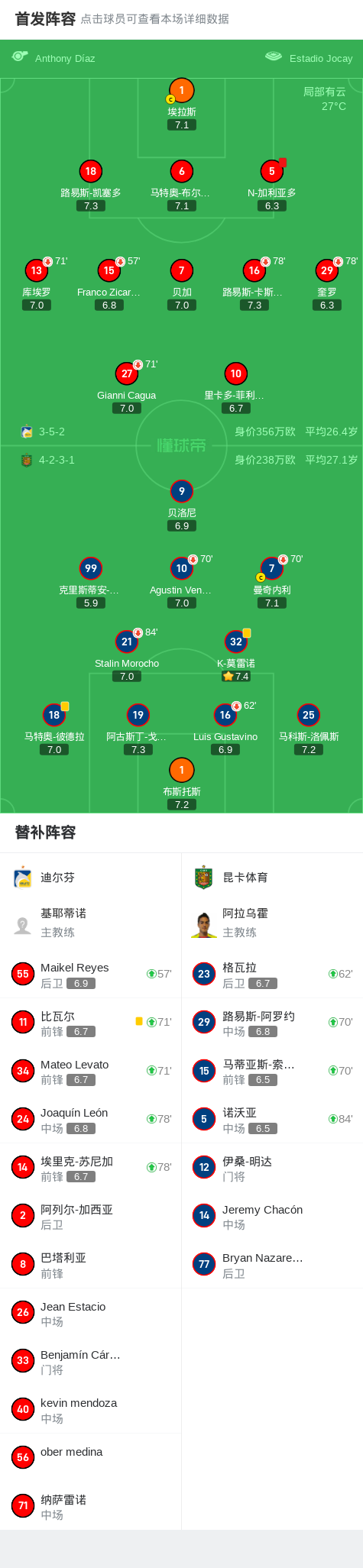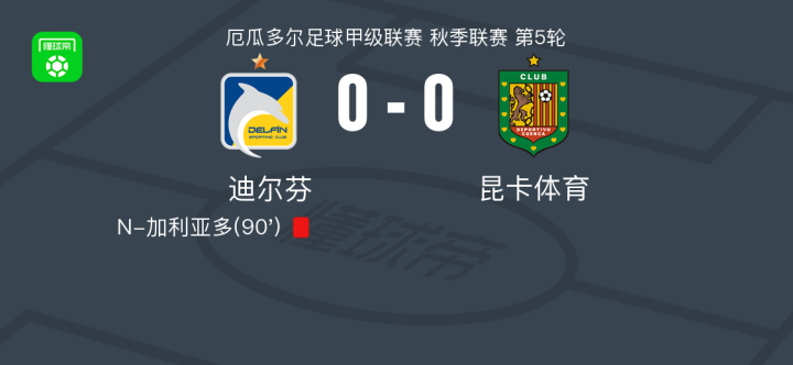 迪尔芬0-0昆卡体育,双方互有攻守战报bot @懂球帝2025-03-16 09:56北京时间3月16日,厄瓜多尔足球甲级联赛秋季联赛第5轮,迪尔芬坐镇主场迎战昆卡体育。全场比赛双方均未能取得进球,最终以0-0的比分握手言和。比赛中,迪尔芬球员N-加利亚多吃到一张红牌,对球队的局势造成一定影响。点击查看本场比赛详细数据>>点击查看厄瓜甲完整积分榜>>精彩瞬间第90分钟,迪尔芬球队N-加利亚多吃到红牌。 球队阵容 技术统计 展开更多