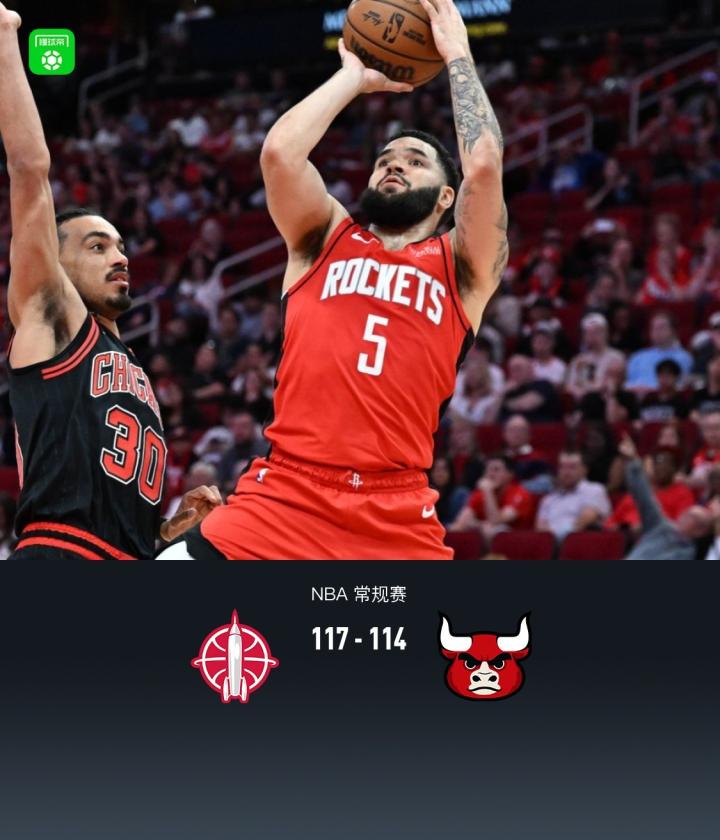 第四节火箭杰伦-格林拿下11分,公牛科比-怀特拿下8分,最终火箭117-114战胜公牛
