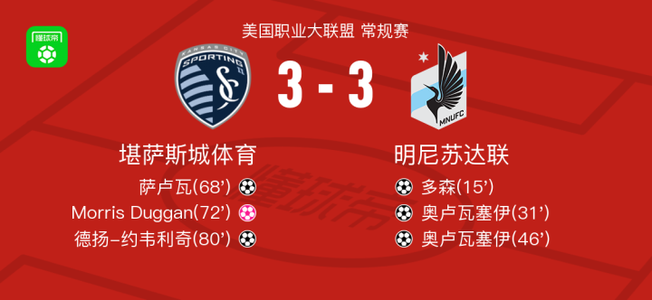 堪萨斯城体育3-3明尼苏达联,德扬-约韦利奇破门,奥卢瓦塞伊双响